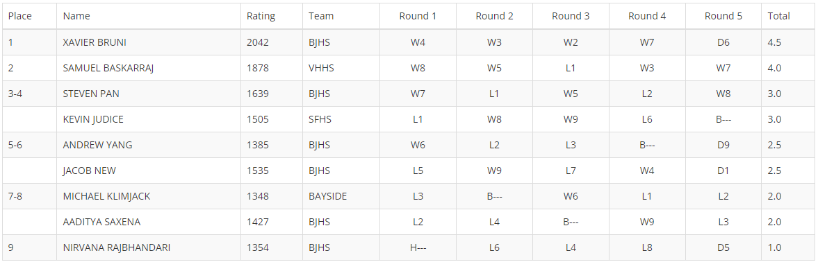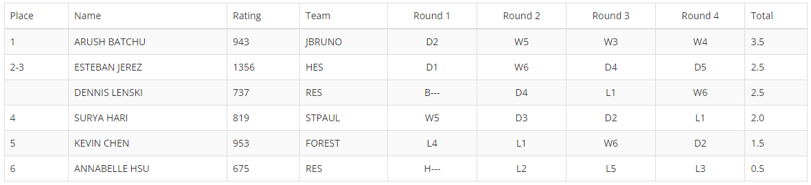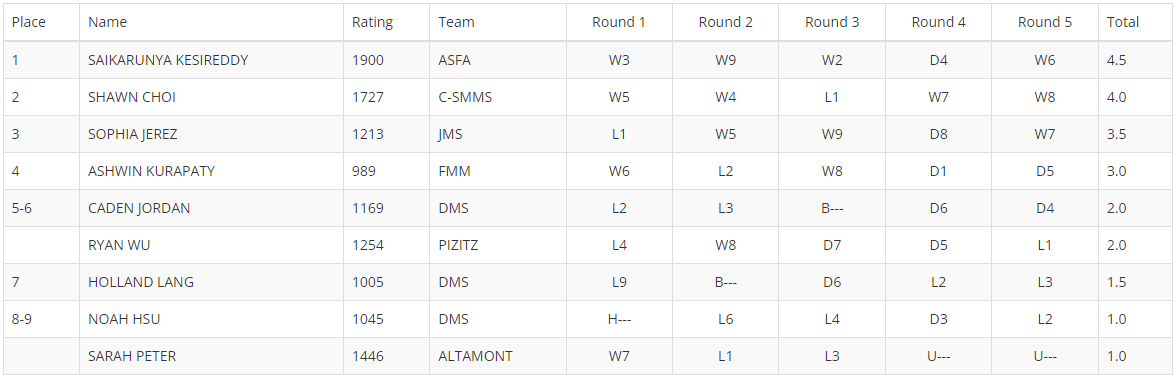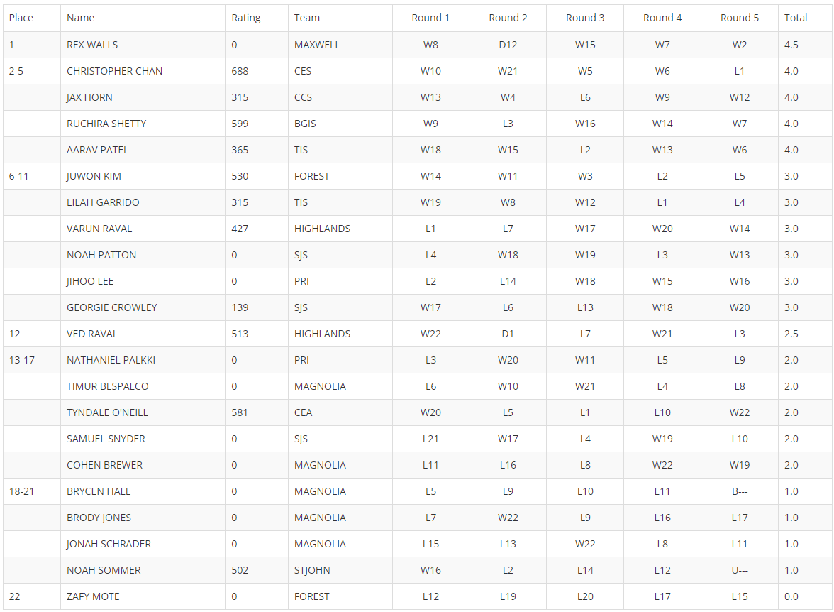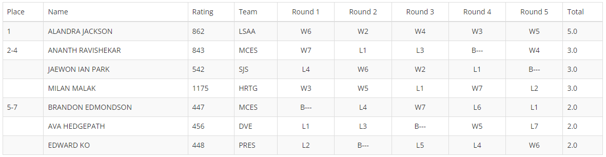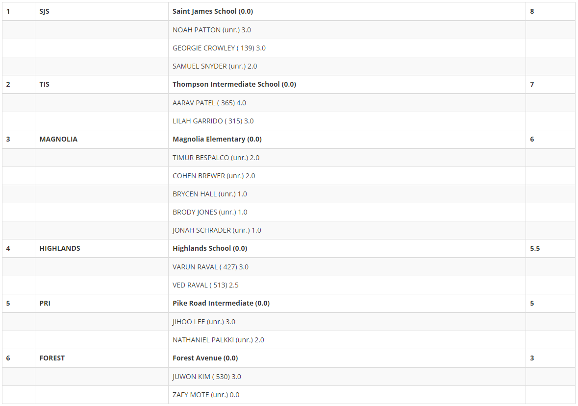 Below is a list of all individual results, followed by team results, and concludes with pictures from this event. We might be done with our tournament, but chess is still happening all around! Here are links for future tournaments and for our summer camps.