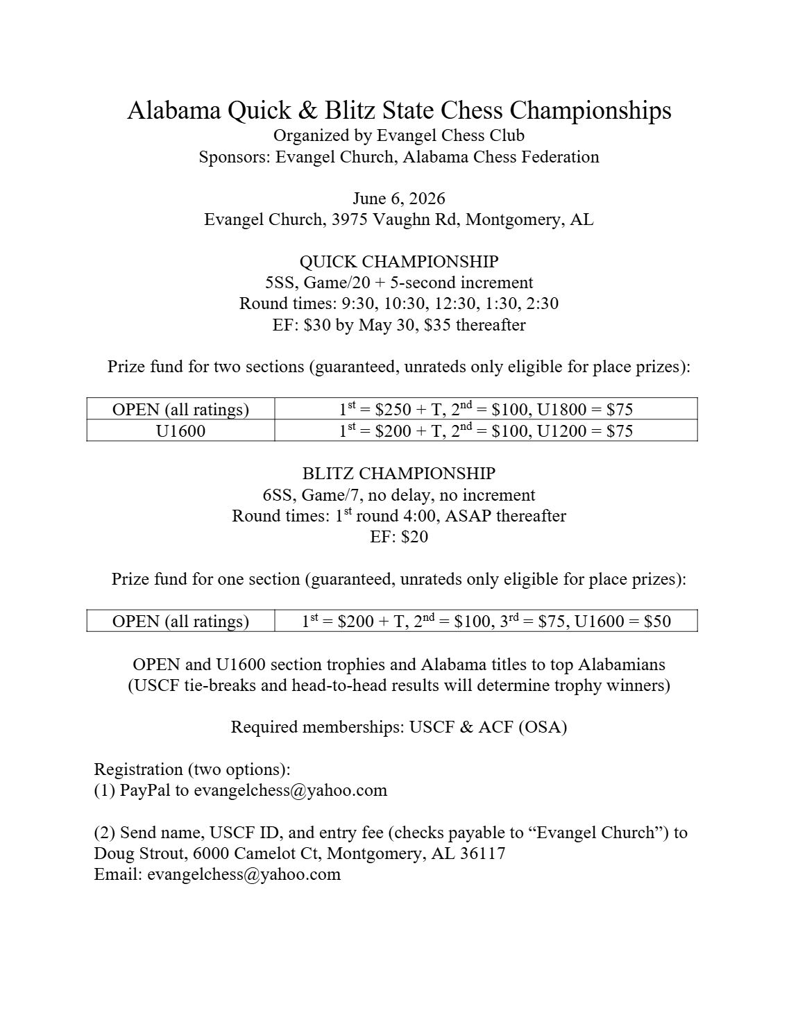 Back to All Events 2026 Alabama Quick & Blitz State Chess Championships Saturday, June 6, 2026 9:30 AM 6:00 PM Evangel Church 3975 Vaughn Road Montgomery, AL, 36106 United States (map) Google Calendar ICS Register by Email Now Register by Email Now