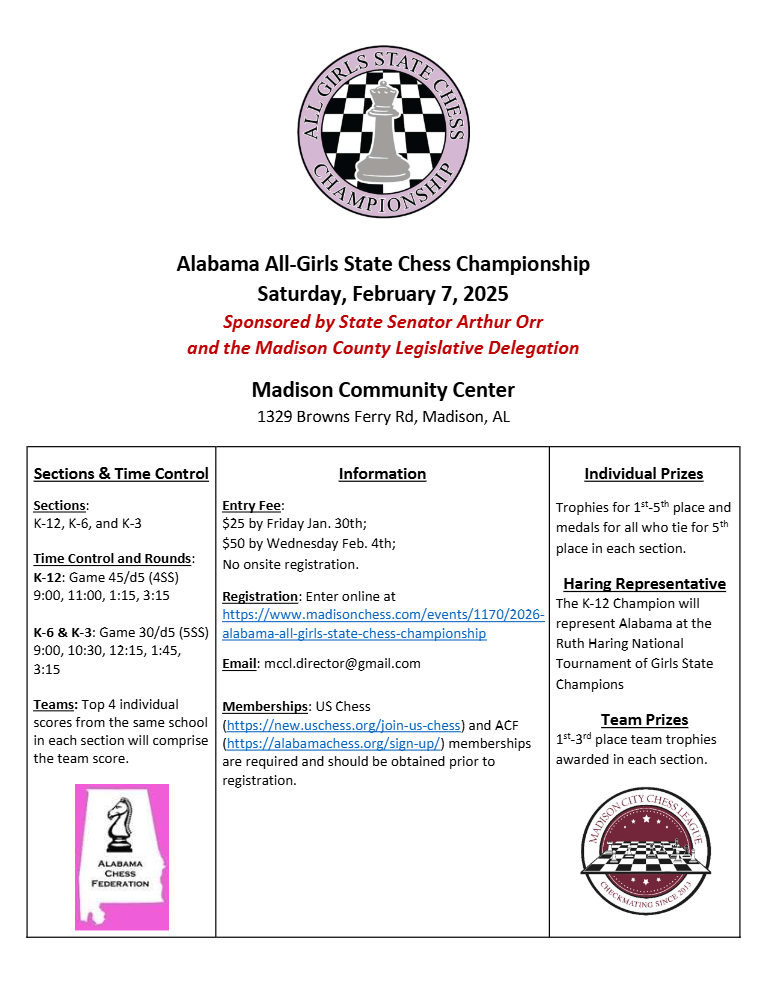 2026 All Girls State Championship Saturday, February 7, 2026 9:00 AM 5:00 PM Madison Community Center 1329 Browns Ferry Road Madison, AL, 35758 United States (map) Google Calendar ICS Register Now!
